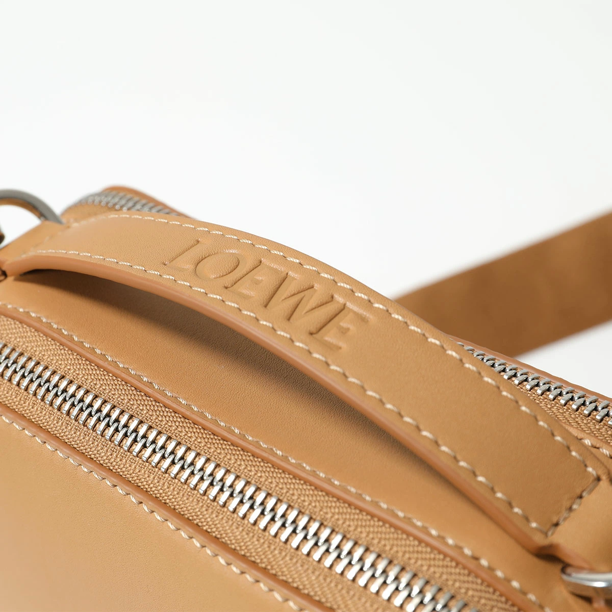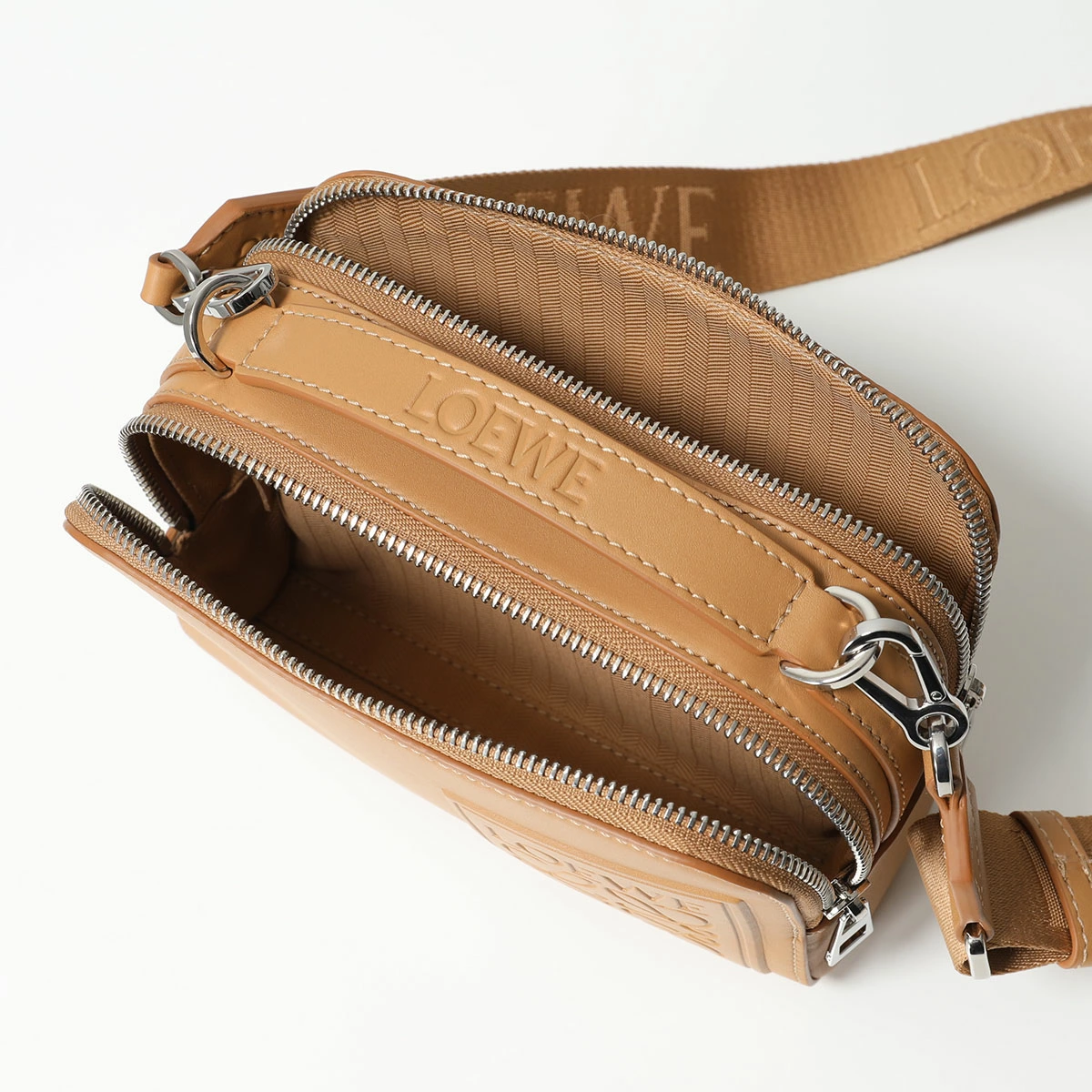 多目的に活躍するウェラブル仕様のミニ カメラ クロスボディバッグ。ジッパー付きコンパートメント2つとLOEWEアナグラムのデボス加工入りパッチを備えています。本アイテムはサテンカーフスキン製